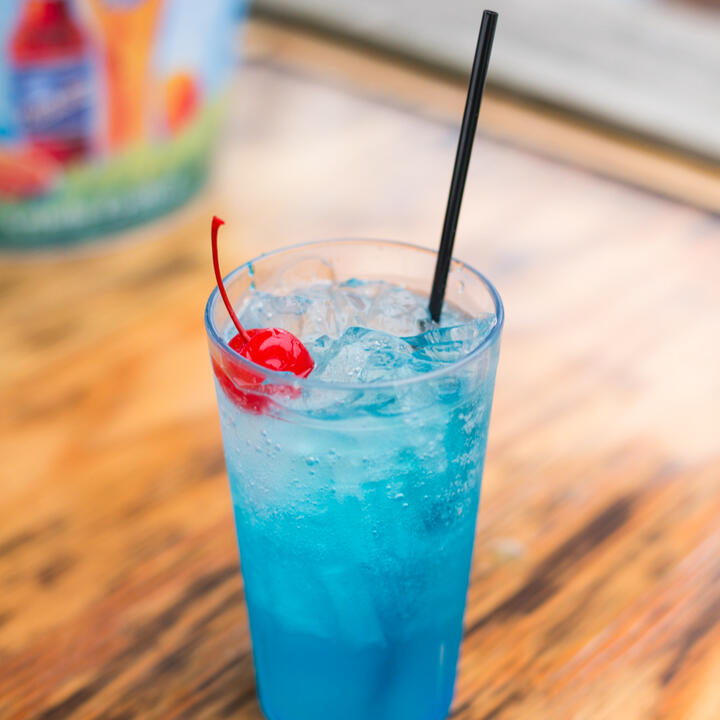 Vodka, lemon-lime juice, and blue curacao, served shaken over ice and topped with a light citrus soda and a lemon wheel garnish