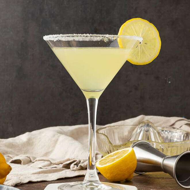 Lemon vodka and Cointreau with fresh lemon juice and a lemon simple syrup, served chilled with a zested sugar rim