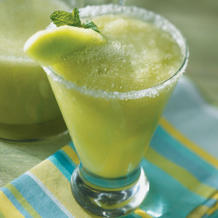 Fresh honeydew blended with tequila, Cointreau, and homemade honeydew syrup, served frozen with a mermaid tail melon garnish